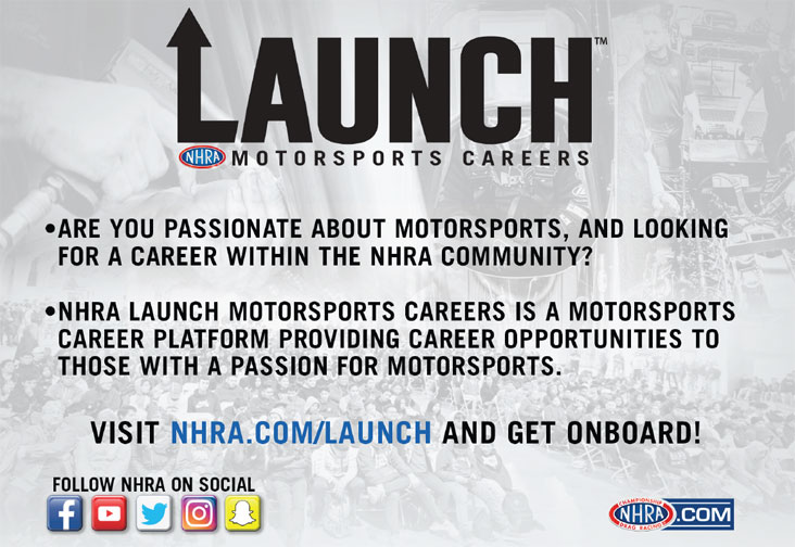 Job seekers are welcome to explore the career portal available in the top ribbon, reach out to our dedicated staff via email launch@nhra.com, or call 626-250-2330 to receive résumé advice, interview coaching, and additional information on the program. Employers within the motorsports community looking to fill open opportunities should email launch@nhra.com or call 626-250-2330 to get on board.