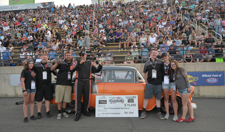 Shawn Fink, a veteran of popular “Drag and Drive” events such as Hot Rod Magazine’s Drag Week and Rocky Mountain Race Week, added another title to his resumé when he wheeled his vintage ’55 Chevy to a win in the Mile-High No Time Shootout, a special event held during Friday qualifying at the Dodge//SRT NHRA Mile-High Nationals at Bandimere Speedway. The No Time Shootout brought together eight of the quickest street cars in the Midwestern U.S. for a heads-up battle on the eighth-mile course.