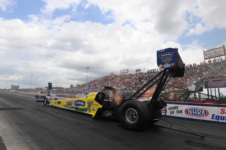 It was a drama-filled second round of Top Fuel, including a quick pop-up shower that paused racing momentarily. It came right before Steve Torrence and Leah Pruett were set to race, and both teams made the daring attempt to head back to their pits for some minor adjustments. Each team told they had to be back in the lanes by the time Top Fuel was done or they would miss their round.