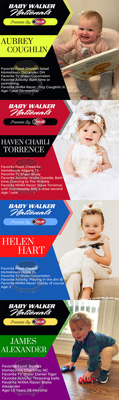 When the Baby Walker tour moves on to Charlotte, two-year-old Helen Hart, daughter of Top Fuel driver Josh Hart and his wife, Brittanie, and one-year-old James Alexander, son of Funny Car driver Blake Alexander and wife Leah, will join the fray.