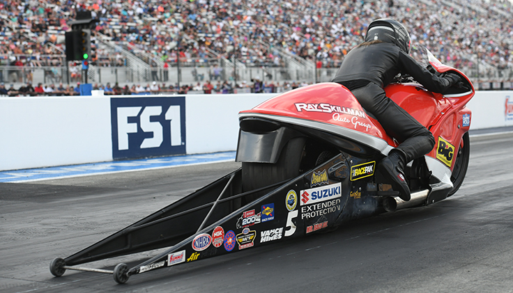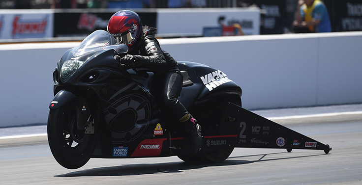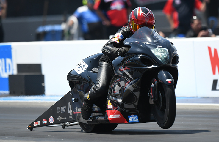 Michael Ray’s nearly perfect reaction time wasn’t enough to help him advance out of the first quad of Pro Stock Motorcycles. That honor went to Eddie Krawiec and Jerry Savoie, who qualified fourth and sixth respectively. Krawiec crossed the finish line first with a 6.796 on his Vance & Hines Suzuki while Savoie wasn’t far behind after a 6.804 on his white Alligator Suzuki. Ray’s 6.962 wasn’t enough to get through and the same could be said for Marc Ingwersen’s 6.936.