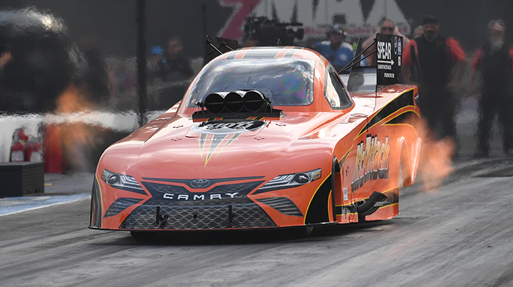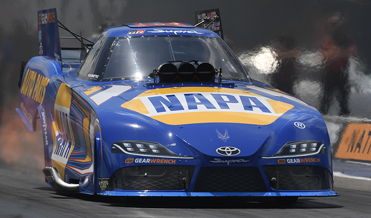 The twin Toyotas of J.R. Todd and Ron Capps advanced together into the semifinals with respective runs of 3.89 and 3.92, giving Capps his first win light in the Toyota GR Supra that made its debut here Friday. With both in the semifinals, it's a good chance for Toyota to get its first national event win with the swoopy new shell.