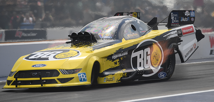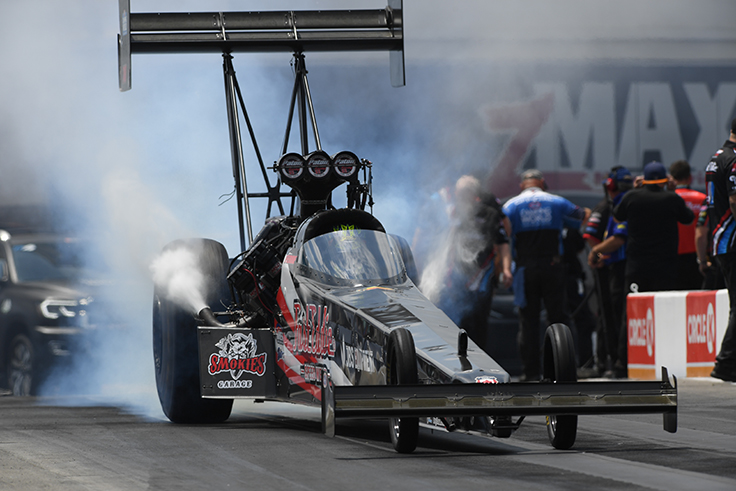 John Force, who broke the track speed record in qualifying with a pass of 334.24, bettered it in round one with a blast of 335.07 but didn’t win his quad, finishing second behind Bob Tasca III, 3.878 to 3.892. Alexis DeJoria finished third behind the pair.