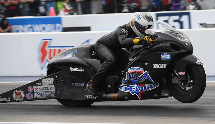 Low elapsed time of the first round went to low qualifier Angelle Sampey, who moved into the second round with a 6.760 on her Vance & Hines Suzuki. Sampey also had one of the best reaction times with a .016 light. Joining Sampey in the quarterfinals will be Joey Gladston, who held off reigning world champion Matt Smith and Kelly Clontz. Gladstone ran a 6.848 to edge Smith’s 6.869. Gladstone also had the second-best light of the quad with a .044. Of the eight riders to make it to the quarterfinals, both Gladstone and Jimmy Underdahl are still seeking their first NHRA victories.