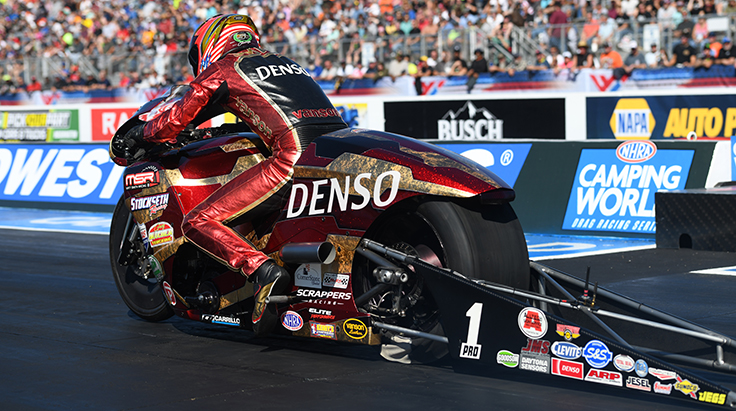 Going back to the regular season, the points lead has changed hands at the last six races in Pro Stock Motorcycle, with defending world champ Matt Smith jumping back on top with his stellar weekend in St. Louis, one that included track records and a career-best pass. But that lead stands at just 21 points over Joey Gladstone, who won in Reading and has been the points leader twice in the past six races.