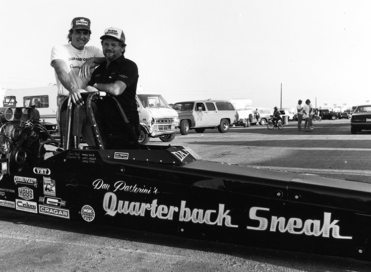 Pastorini’s road from the huddle to the cockpit was long in coming. As early as 1980, he was crewing on Raymond Beadle’s Blue Max Funny Car and making a deal to buy the Max Top Fueler (driven previously by Dave Settles), but none of that came to fruition. In 1985, he and crew chief Bobby Rowe (yes, the great former Funny Car racer) bought the national-speed-record-setting Dago Red Top Fueler from Frank Taylor but found the cockpit too small, so he sold it to Eddie Hill, who famously made his comeback to the sport in that car the following year. He bought the ex-Kilpatrick & Connell dragster — driven to victory at the 1983 Springnationals by Richard Tharp — from Gene Snow, and went racing in 1985, with the talented Donnie Couch added on wrenches, but didn’t win a round until the 1986 Gatornationals.