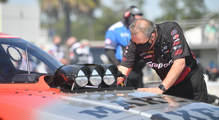 “You don’t see it as much on Funny Cars, because it’s harder to do inside the body, but the Top Fuel teams will usually clean the tires with their hands to remove any debris that might be sticking to the tires after the burnout. They also check the wheelie bar to make sure it’s set correctly.”