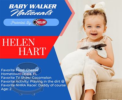 Hart and his team will also be supporting another racer this weekend as his daughter Helen will be participating in the second Baby Walker Nationals event. Two-year-old Helen Hart, daughter of Top Fuel driver Josh Hart and his wife, Brittanie, and one-year-old James Alexander, son of Funny Car driver Blake Alexander and wife Leah, will square off on Saturday between rounds in what after just one event in Houston has become a fan favorite. The race, which is backed by Red Line Oil, will be a one-shot, winner-take-all, dash-for-cash with the winner earning $100 from Red Line Oil plus a gift card good for an additional $100 worth in oil and other Red Line lubricants for future Jr. Dragster competition.