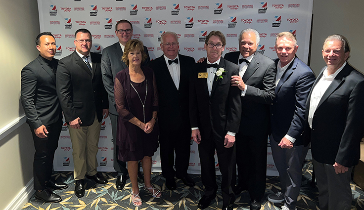 Kim and Jeff LaHaie, fourth from left and right, respectively, children of the late Dick LaHaie, represented their father at his induction. Also on hand were, from left, NHRA's John Baadilla, Ned Walliser, and Mike Rau; hall of fame crew chief Tim Richards, who is married to Kim; NHRA legend Don "the Snake" Prudhomme; and NHRA's Glen Cromwell and John Siragusa,