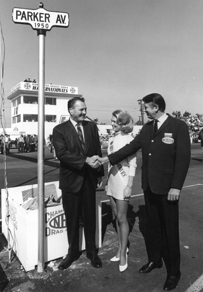 NHRA Founder and President Wally Parks and team had spent the first two years of NHRA (1951 and 1952) working tirelessly with police officials across the country, asking for their help and cooperation in turning the public opinion about hot rodders. The real breakthrough and model of this desired cooperation had come in Pomona, when Chief Parker, who in December 1951 had written a hot rodding-favorable article in the FBI Law Enforcement Bulletin, which is distributed to law-enforcement groups throughout the United States, tasked Coons to begin interacting with the Choppers. Coons got a firsthand look and understanding of the kind of people the sport attracted. Parker was honored in 1969, when Parks and the NHRA christened the Pomona Raceway track as "Parker Avenue."