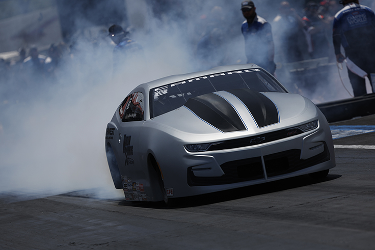 Houston isn’t exactly a home event for Chris McGaha, who lives half a continent away in Odessa, Texas, but he’s still a native of the Lone Star State and naturally wants to win the final event here. McGaha moved a step closer to that goal when he scored a big victory against current points leader Aaron Stanfield. McGaha drove his Silver Bullet Camaro to a 6.628 to turn on the win light after Stanfield shook the tires. For McGaha, the win was a huge relief after his Harlow Sammons team changed engines on Saturday and came into eliminations with very little tuning data.