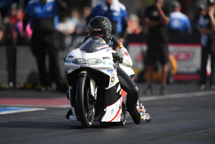 Five-time world champion Matt Smith and veteran Steve Johnson will meet for the final Pro Stock Motorcycle title at Houston Raceway Park. Smith rode to his 65th final, and his first on a Suzuki, after low qualifier Karen Stoffer crossed the centerline. Johnson, the class’ most experienced rider, will be seeking the tenth win of his career after stopping Eddie Krawiec, 6.765 to 6.802. So far, Johnson has had the quickest bike in the field with a pair of 6.71-second runs that rank among the quickest in the history of the class.
