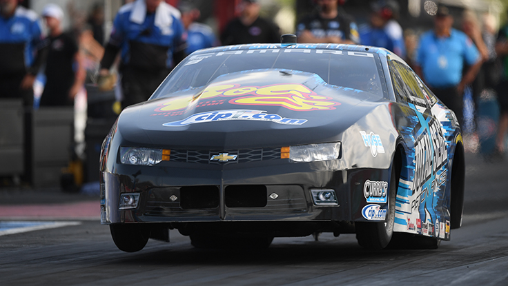 This has been a weekend of firsts for first-year Pro Stock racer Camrie Caruso, who has so far backed up her low qualifying effort with a pair of win lights on Sunday. Caruso beat Fernando Cuadra Sr. in round one and then stopped Bo Butner in round two after Butner got crossed up and hit a timing block off the starting line. Caruso later noted that her team had a pit area thrash between rounds after they discovered an undisclosed mechanical problem.