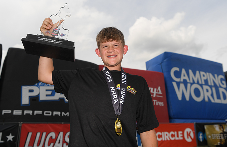 Peterson, 12, of North Ft. Myers, Fla., came from the No. 3 qualifying position to the final, where he beat McMaster, who fouled at the start. For Peterson, the win at the Circle K Four Wide Nationals in Charlotte adds to a long list of achievements that already includes back-to-back Division 2 championships in the Intermediate division. Peterson previously won 12 NHRA Wally trophies. Peterson’s road to the final included wins against Bricen Hartmann and Tanner Mocny.