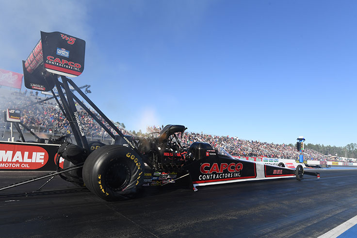 Hometown hero Josh Hart, who won the Gatornationals last year in his Top Fuel debut, won’t repeat after losing to Justin Ashley in round one. Hart, who exploded the blower in Saturday’s go-for-broke, one-shot qualifying, did it again against Ashley, losing an early lead he gained with a phenomenal.014 reaction time. Ashley, winner of the season-opening Winternationals, clocked a 3.68 for the win.