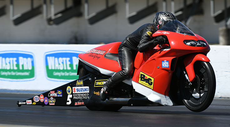 Think Karen Stoffer’s record-setting 6.682 in the first round of Pro Stock Motorcycle was impressive? How about the second round where the Big St. Charles Suzuki rider once again lowered the boom with a 6.665 that easily outdistanced Eddie Krawiec’s 6.927. NHRA no longer requires a 1-percent back-up in order to establish a national record, but if they did, Stoffer would still easily be in control of the elapsed time mark. Incidentally, two of Stoffer’s ten career wins have come at Gainesville Raceway.