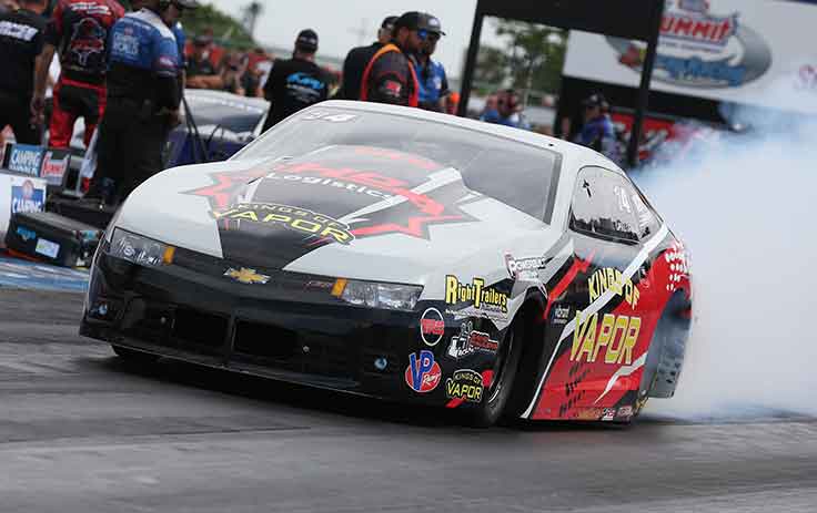 It took just one pair for those improved conditions to yield dividends as Josh Hart recorded a 3.756 in his opening round win against Spencer Massey, who made a rare miscue on the starting line when he double-stepped the throttle on Pat Dakin’s Commercial Metal Fabrication dragster and red-lighted. Hart is flying the colors of R+L Carriers which has a terminal located directly across the street from Summit Motorsports Park.