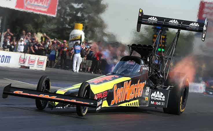 The “Oh my gosh” moment of the round came when world champ and low qualifier Ron Capps took on Dale Creasy Jr. At the start, Capps smoked the tires, opening the door for Creasy to score an upset win. Creashy’s Tek Pak Dodge also lit the tires, and careened over the centerline, narrowly missing Capps’ NAPA Toyota. Creasy was officially disqualified because he crossed the centerline and knocked over the 660-foot timing blockes, but he managed to get the car under control enough to avert a disaster.