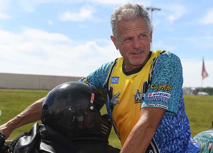 Three-time world champ Angelle Sampey made it to the final round for the 80th time in her career after beating Bristol winner Jerry Savoie in the semi’s. Sampey was late in firing her Vance & Hines Suzuki but she didn’t appear to be the least bit distracted as she rode to a 6.855 to earn lane choice over Joey Gladstone.