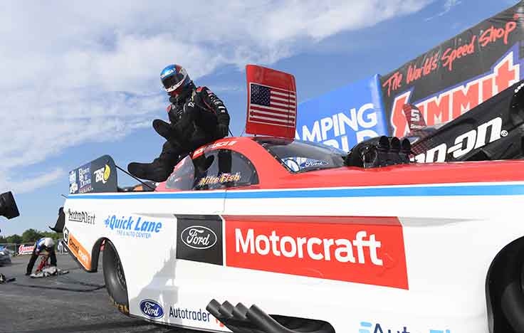 Bob Tasca III got a great view of Mike McIntire’s colorful MacAttack Toyota but only because McIntire left on a very early red-light. Tasca managed to hold steady with a strong 3.921 to give him lane choice in the quarterfinals against championship leader Matt Hagan. Tasca was one of the drivers who would have preferred the sunny conditions that were present on Friday and Saturday since his Motorcraft QuickLane Ford was one of the most consistent cars in qualifying and he was starting from the No. 4 spot.