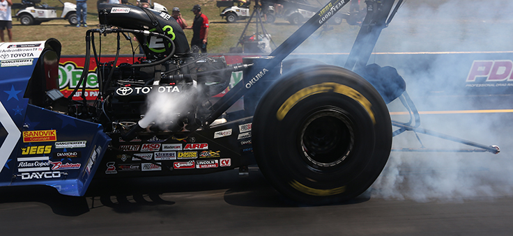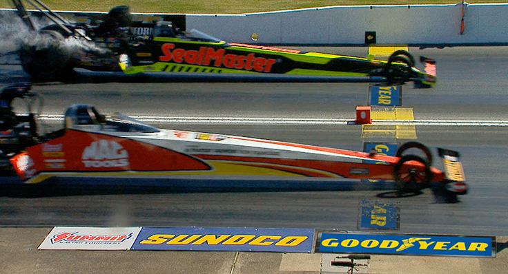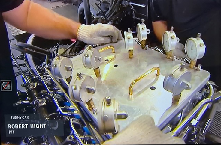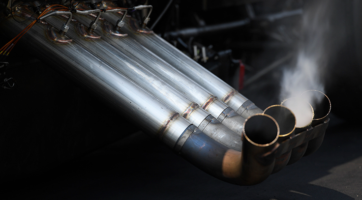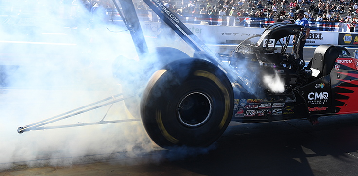 Could you explain why the nitro cars drop cylinders on the burnout? 1/8th of an inch throttle opening, but on the low side of the fuel system might explain why they are rich. They seem to pick the cylinders back up when the car returns to idle, or after they have backed up and the crew chiefs have adjusted the idle. — Rob Cook