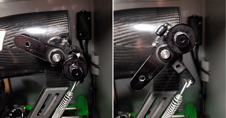 In the picture at left, it is engaged, the hole on the left is where the throttle cable attaches. You can see the small air fitting on the cylinder. When the system activates, it pulls the pin and disconnects the throttle lever from the throttle shaft, as you can see in the second picture.