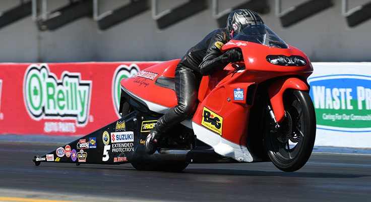 The favorite: After her stunning performance in Gainesville, including the sport’s first 6.6-second runs and a convincing victory, how could this be anyone other than Karen Stoffer? Competing in what could very well be her final season as a full-time pro, Stoffer looks to continue her quest for a championship in Houston, where she won back-to-back titles in 2004-05. The rest of the field has had more than a month to catch up to Stoffer, but there is a lot of work to be done. For now, the rider of the Big St. Charles/Skillman Auto Suzuki has the edge.