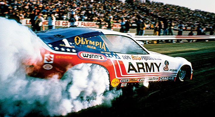 Prudhomme, Bob Brandt, and the Army Monza began the season with a huge win at the Winternationals — his third of four straight at the annual season opener — where he also reset the national record en route to capturing his 15th victory, which tied him atop NHRA’s all-time winner’s list with Ronnie Sox. The tie didn’t last long as, in quick succession, “the Snake” struck at the Gatornationals, Springnationals, Summernationals, and Le Grandnational.