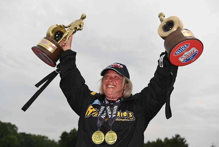Lauren Freer made history in Norwalk when she won the Super Comp and Super Gas titles at the Summit Racing Equipment NHRA Nationals. Freer became the 30th driver to double up at an NHRA national event, but more significantly when she became the first woman to accomplish the difficult feat. Anyone who’s watched Freer during her career is well aware of her talent level, but doubles are among the most difficult feats in drag racing, which is why there have been so few. Freer tackled Super Comp first and notched her first win in seven years when she overcame Dave Dahlem’s .005 light to win, 8.91 to 8.94. A short time later, she returned in Super Gas and completed the perfect weekend with a very narrow win against Pat Martin, 9.911 to 9.916. Both drivers were tuned into the starting line with Freer holding a very slight .005 to .007 edge off at the start. The only other driver to double up at a national event this season was Anthony Bertozzi, who gets an honorable mention for winning two classes in Pomona.