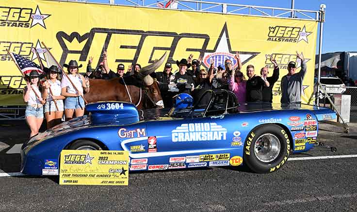 Rusty Cook seems to enjoy the annual JEGS Allstars event because he continues to come back to the special event year after year. This season, Cook, who races out of the Southeast Division, won his third straight JEGS Allstars title and fourth overall when drove his Ohio Crankshaft Corvette past Steve Parsons of Division 7 in Super Gas. Cook rose to the occasion in the final with a .003 light and a 9.909 that was nearly unbeatable. As the defending champion, Cook is also eligible to return for next year’s JEGS Allstars race at the Texas Motorplex as a blocker, so he’ll have a shot at a fifth title.