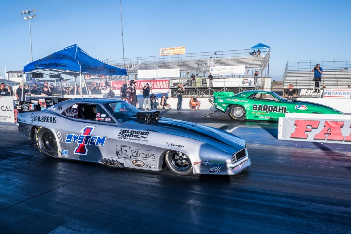 Bobby Cottrell, far lane, has been unstoppable this season in Nostalgia Funny Car and picked up another victory in Bakersfield with a 5.66 in the final to stop Brad Thompson’s System 1 Camaro.