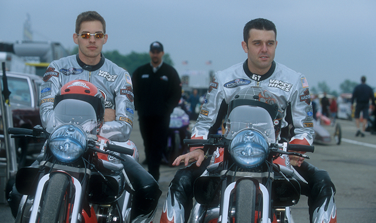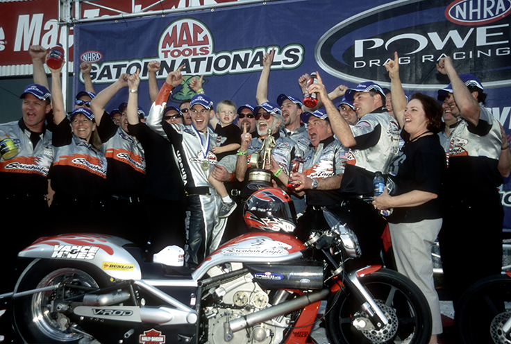 The Vance & Hines team, long a bastion of Suzuki power, switched to Harley-Davidson in that 2003 season, and Andrew won his first event at the 2004 season-opening Gatornationals and scored twice more to win his first of three straight championships by less than a round’s worth of racing over Sampey, who by now was riding for Don Schumacher on a two-bike U.S. Army team with Antron Brown, who would finish second behind Hines in 2005.