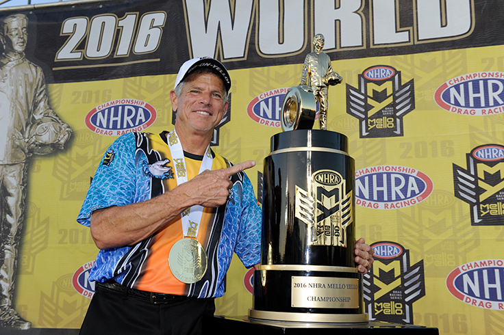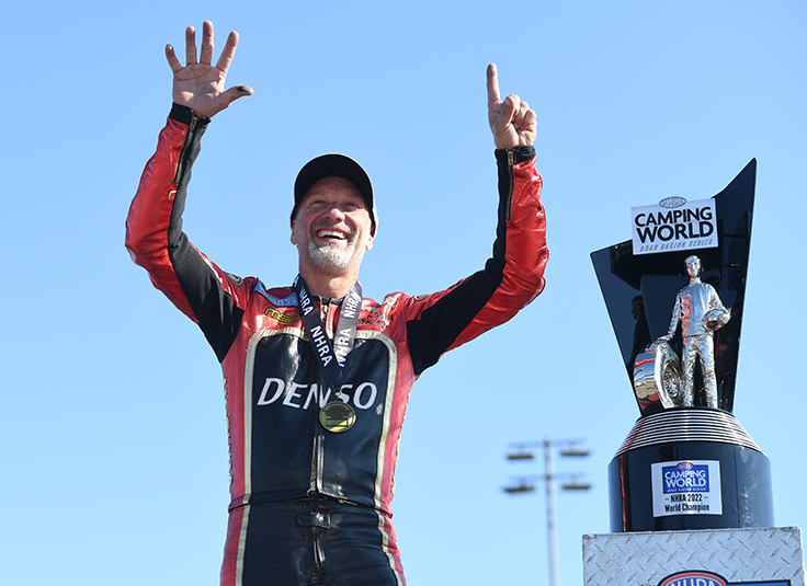 Repeating as champion became an impossible task as subsequent titles were won by Hines’ new teammate, Eddie Krawiec — who won the 2008 crown without a single event win, only the second time in NHRA history that had happened (Rob Bruins, Top Fuel, 1979) — class veteran Hector Arana Sr. (a five-win 2009), and another second-generation Tonglet, LE., the younger brother of Hines’ former teammate, L.E. also scored five wins en route to his title.