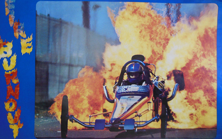 “T.C. [Lemons] and [Don] Garlits did the best unplanned fire burnouts. ‘TV Tommy's' [Ivo] fire burnouts were nice but always planned, ‘Tarzan’ [John Austin] liked to try to burn up Ivo. ‘Jungle Jim’ did the best Funny Car fire burnouts with Bobby Rowe in Schumacher's blue Stardust Funny Car running a very close second. “
