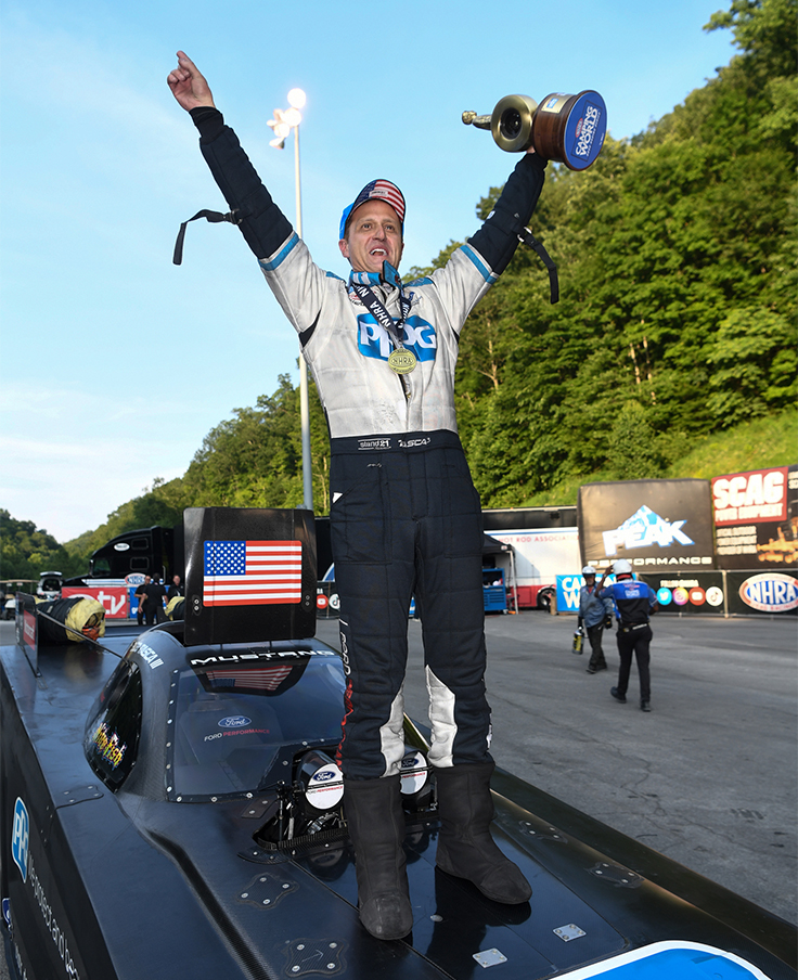 Bob Tasca III has achieved much in his tenure as a nitro Funny Car driver, but winning the New England Nationals was the one thing the Rhode Island native just couldn't seem to make happen. On an unusual Saturday at Bristol Dragway, Tasca and his PPG-branded Motorcraft/Quicklane Ford team finally earned that home-race trophy — and they did it at Tasca's home-away-from-home.