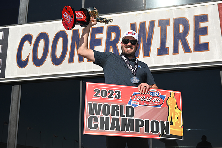 Rizzoli’s first world title was tied up at the NHRA Nevada Nationals in Las Vegas when Jeremy Romero, the lone remaining racer with a shot at catching him, bowed out early. Rizzoli was in the staging lanes waiting to run a round in his Super Stock entry, a well-equipped car graciously on loan from the Gaynor family, when he got the news that he was officially the 2023 NHRA Lucas Oil Drag Racing Series Stock world champion.
