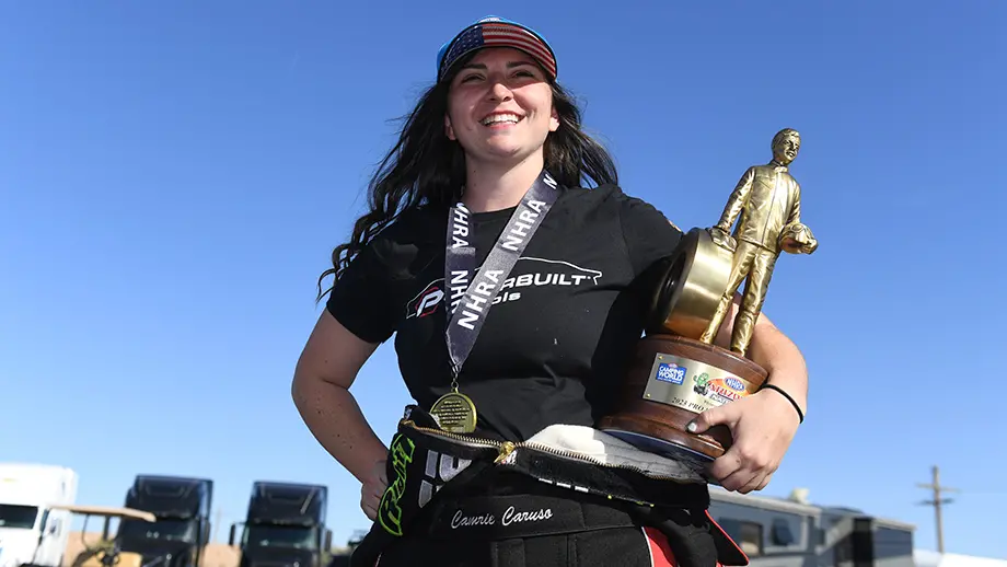 Caruso is the 19th woman to win an NHRA Professional title and her victory was the 188th by females in NHRA Pro competition and 361st time overall.