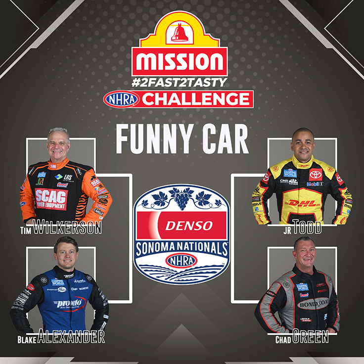 In Funny Car, Tim Wilkerson will face a rematch with Norwalk winner Blake Alexander while J.R. Todd races Chad Green, who has been a magnet for the Mission-backed events this season. While Green has yet to win a professional event, or even appear in a final round, he has reached the semifinals seven times with his Bond Coat Mustang.