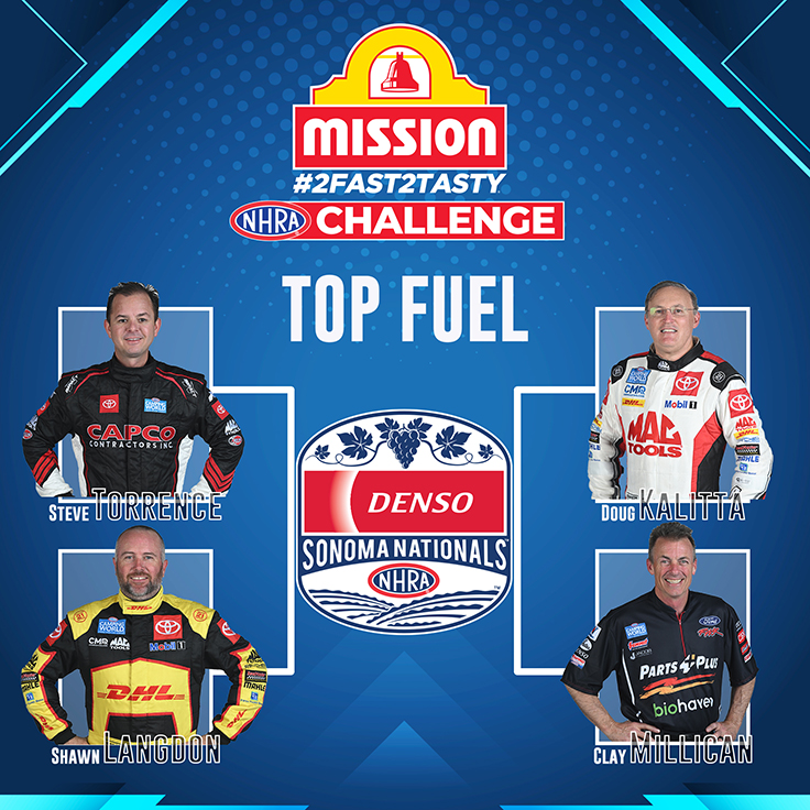 Today’s Mission Foods #2Fast2Tasty Challenge will include the semifinal finishers in Top Fuel and Funny Car from last weekend’s Flav-R-Pac NHRA Northwest Nationals in Seattle. Event winner Steve Torrence will take on Shawn Langdon in round one while runner-up Doug Kalitta will be paired against Denver winner Clay Millican.