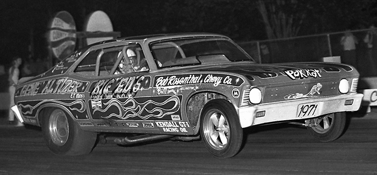 Here’s Virginian Gene Altizer in his Logghe-chassised Big Ed's Speed Shop-sponsored Pak Rat Nova at Cecil County in 1971; this also-ex-"Jungle Jim" entry was one of the bad-ass injected cars of the era. Check out the square roll cage that was typical of these cars — a far cry from today's formfitting cages — and the not-quite-zoomie headers.