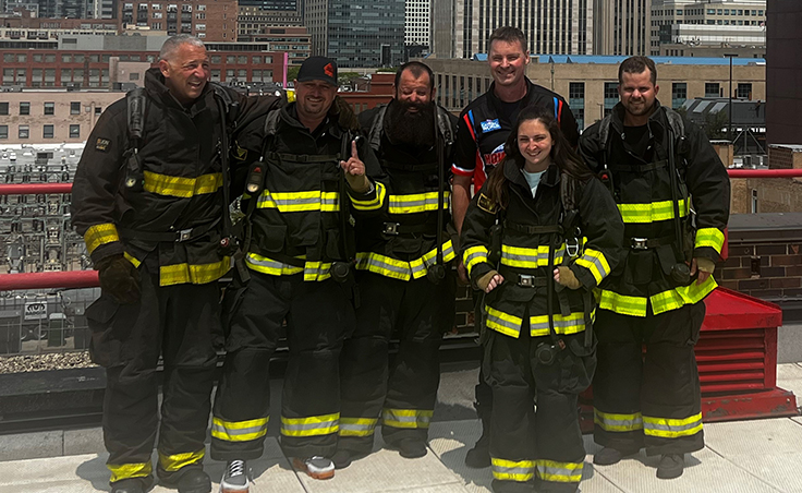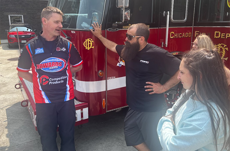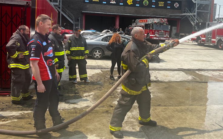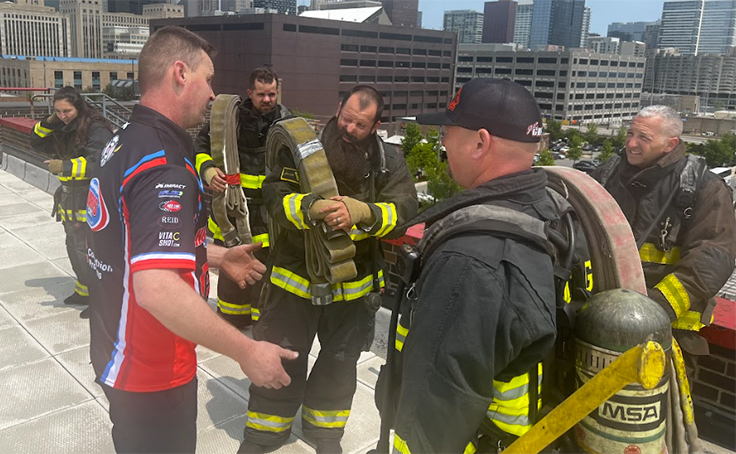 The group was outfitted in full fire protection gear, including air tanks which added just over 35 pounds to each driver plus a variety of firefighting tools before they took on the challenging “up and over” drill, which included five flights of stairs up a run across the top of the training facility and then five flights of stairs down to the main floor. The group paused for a photo with the famed Chicago skyline in the background before continuing with more drills. This event was something King has been planning since he broke onto the NHRA Funny Car scene in 2021.