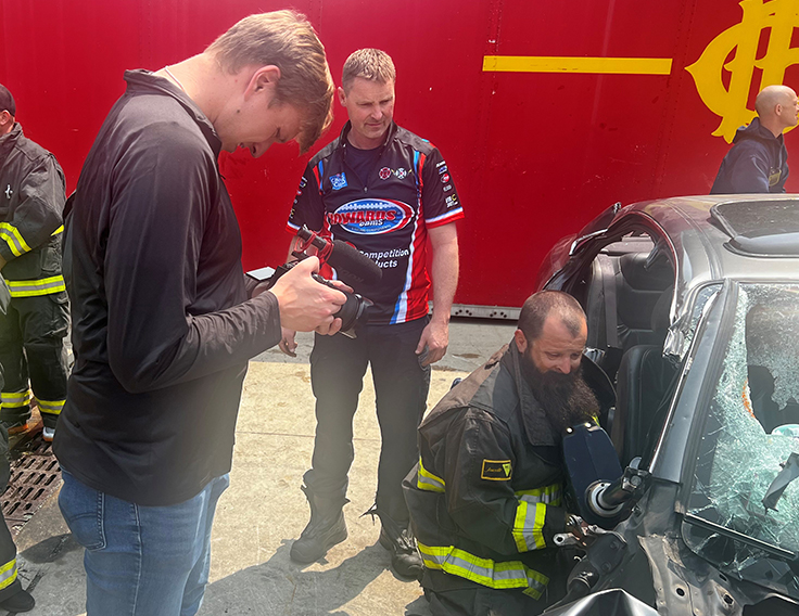 Following the “up and over” drill, the group was instructed how to properly breach a door, and they took turns simulating pulling a 150-pound person out of a fire. They were also provided the opportunity to man a pressurized fire hose, shoot water across the training facility, and go through a multi-stage obstacle course. The highlight of the event for the drivers was the chance to use a variety of cutting and prying tools to dissect several automobiles.