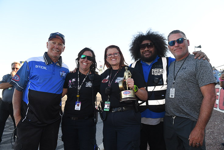 The incredibly quick and selfless actions of the first responders to a medical emergency at the front of the staging lanes on Friday morning at The Strip at Las Vegas Motor Speedway made all the difference. Without hesitation, (from left, above) Dale Shubert, NHRA staging lane operator; Colette Walker, LVMS paramedic; Penny Wedge-Gernes, LVMS paramedic; Penoa Maluia, CSC Security; and Jim Glenn, 2022 Super Comp world champion, jumped into action. For their tremendous and relentless efforts, they were – quite rightfully – presented with the Never Rest Performer Award. From all of us to all of you, thank you.