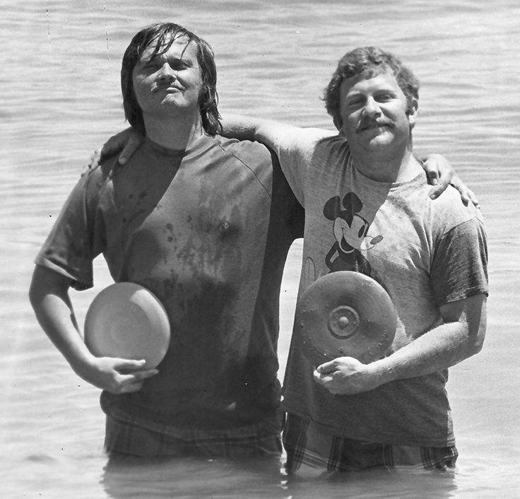 Somewhere, I have a photo of John and me in my ski boat at Lake Isabella. But this one of him and Bill Crites with Frisbees at that same outing is priceless.