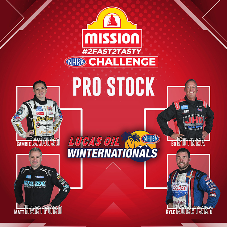 Arizona Nationals winner Camrie Caruso is also taking part in her first Mission Challenge and she enters the special event flying high after having Friday's best run, a 6.519, in her Powerbuilt tools Camaro, She'll rematch with Matt Hartford, who had Friday's second-best run, a 6.524, setting up what should be a tight race. Arizona nationals runner-up Bob Butner, meanwhile, will face off with Kyle Koretsky. Butner clocked a 6.533 on Friday while Koretsky charted a 6.553.
