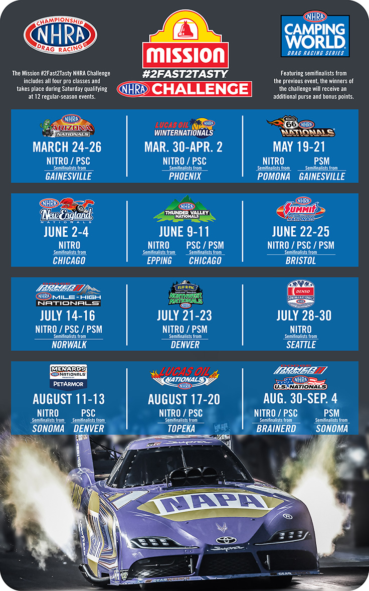 Beginning at the NHRA Arizona Nationals in Phoenix on March 24-26, the Mission #2Fast2Tasty NHRA Challenge will introduce competitive racing to the Saturday schedule at regular-season events during the NHRA Camping World Drag Racing Series campaign, pitting semifinalists from the previous race against each other in a rematch for all Professional categories as part of a must-see challenge.