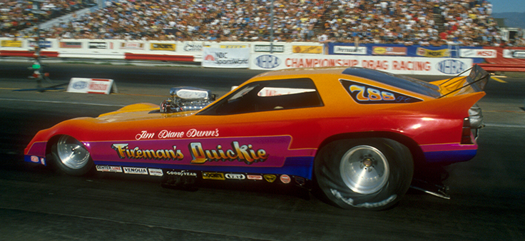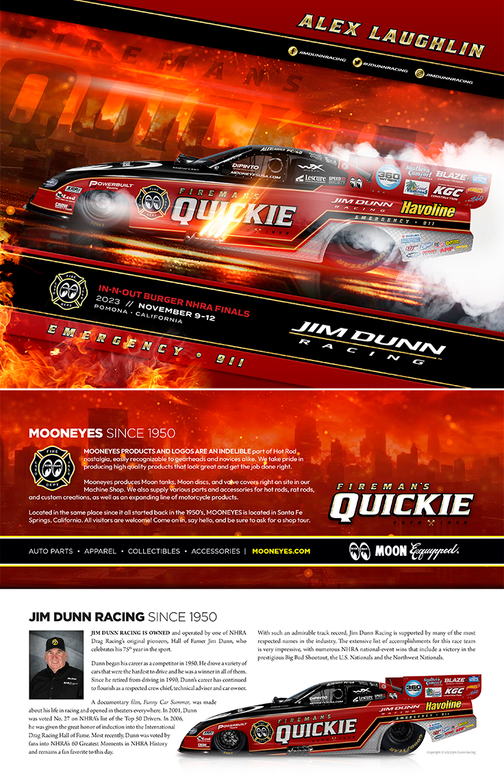 The Moon Equipment Company is honoring nitro legend Jim Dunn by turning over the sides of the Jim Dunn Racing Funny Car normally adorned in Pomona with the trademark Mooneyes logo to allow the team to run a tribute paint scheme honoring Dunn’s iconic Fireman’s Quickie cars of the 1980s.