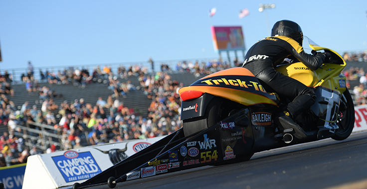 Van Sant has qualified at all 12 Pro Stock Motorcycle events this year, has been to four semifinals, and owns a 12-12 win-loss record with wins against highly regarded veterans like Matt and Angie Smith, Hector Arana Jr., Steve Johnson, and Joey Gladstone, and had qualified his Tim Kulungian-tuned bike in the top five at the last four events prior to the FallNationals.