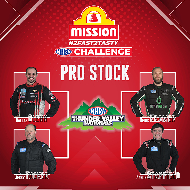 In Pro Stock, the Mission #2Fast2Tasty Challenge will feature Chicago winner and incoming points leader Dallas Glenn and his RAD Torque Systems Chevrolet vs. Elite Motorsports-powered rookie Jerry Tucker. It will be the first #2Fast2Tasty bonus race for Tucker and the second for Glenn.