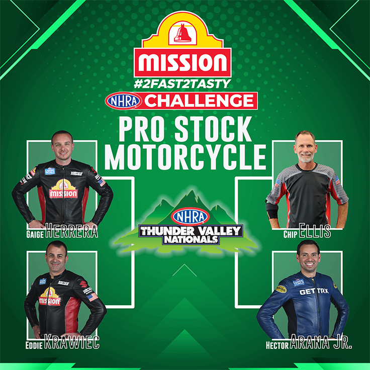 The Pro Stock Motorcycle Mission #2Fast2Tasty NHRA Challenge will include Chicago winner Gaige Herrera vs. Vance & Hines Mission Foods teammate Eddie Krawiec. They're well-matched as Herrera is currently No. 1 in Bristol qualifying with Krawiec just behind in the No. 2 spot.